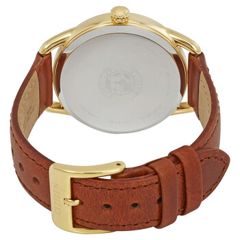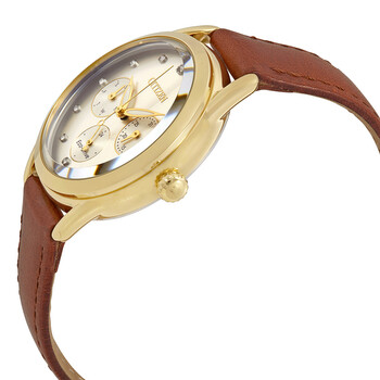 Yellow gold-tone stainless steel case with a brown leather strap. Fixed yellow gold-tone bezel. White dial with luminous yellow gold-tone hands and swarovski crystal hour markers. Dial Type: Analog. Luminescent hands. Three multi-function sub-dials displaying: date, day of the week and 24 hours. Citizen caliber Eco-Drive 8729 quartz movement. Scratch resistant mineral crystal. Pull / push crown. Solid case back. Round case shape. Case size: 38 mm. Case thickness: 10 mm. Band width: 16 mm. Band length: 7 inches. Tang clasp. Water resistant at 30 meters / 100 feet. Functions: date, day, hour, minute, second. Dress watch style. Watch label: Japan Movt. Citizen LTR Crystal White Dial Ladies Watch FD2052-07A.