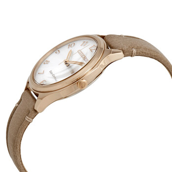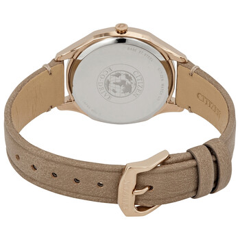 Rose gold-tone stainless steel case with a taupe (vegan) leather strap. Fixed rose gold-tone bezel. Silver dial with rose gold-tone hands and Arabic numeral hour markers. Dial Type: Analog. Citizen caliber Eco-Drive E031 eco-drive movement. Scratch resistant mineral crystal. Pull / push crown. Solid case back. Round case shape. Case size: 35 mm. Case thickness: 8.9 mm. Band width: 16 mm. Tang clasp. Water resistant at 50 meters / 165 feet. Functions: hour, minute, second, solar-powered. Casual watch style. Watch label: Japan Movt. Citizen LTR Eco-Drive Ladies Watch EM0753-01A.