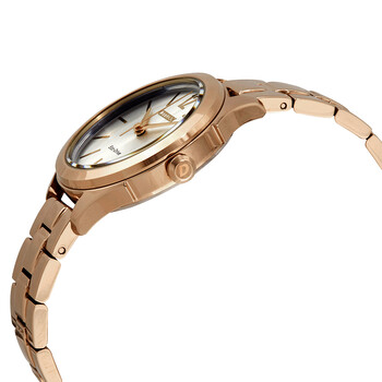 Rose gold-plated stainless steel case and bracelet. Fixed rose gold-plated bezel. Silver dial with rose gold-tone hands and index hour markers. An Arabic numeral appears at the 12 o'clock position. Minute markers around the outer rim. Dial Type: Analog. Luminescent hands. Date display at the 3 o'clock position. Citizen caliber Eco-Drive J810 eco-drive movement. Scratch resistant mineral crystal. Pull / push crown. Solid case back. Round case shape. Case size: 34 mm. Case thickness: 9 mm. Band width: 16 mm. Fold over clasp. Water resistant at 30 meters / 100 feet. Functions: date, hour, minute, second, solar-powered. Casual watch style. Watch label: Japan Movt. Citizen LTR - Long Term Relationship Eco-Drive Silver Dial Ladies Watch FE6143-56A.