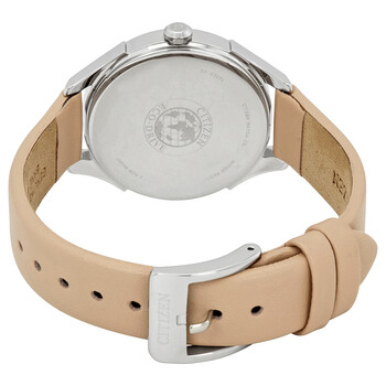 Stainless steel case with a beige leather strap. Fixed stainless steel bezel. White dial with rose gold-tone hands and index hour markers. An Arabic numeral appears at the 12 o'clock position. Minute markers around the outer rim. Dial Type: Analog. Luminescent hands. Date display at the 3 o'clock position. Citizen caliber Eco-Drive J810 eco-drive movement. Scratch resistant mineral crystal. Pull / push crown. Solid case back. Round case shape. Case size: 34 mm. Case thickness: 9 mm. Band width: 14 mm. Tang clasp. Water resistant at 30 meters / 100 feet. Functions: date, hour, minute, second, solar-powered. Casual watch style. Watch label: Japan Movt. Citizen LTR - Long Term Relationship Eco-Drive White Dial Ladies Watch FE6140-03A.
