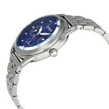 Stainless steel case with a stainless steel bracelet. Fixed stainless steel bezel. Blue dial with luminous silver-tone hands and Swarovski crystal hour markers. Dial Type: Analog. Luminescent hands. Date display at the 3 o'clock position. Three multi-function sub-dials displaying: date, day of the week, and 24 hours. Citizen caliber Eco-Drive 8729 quartz movement. Scratch resistant mineral crystal. Pull / push crown. Solid case back. Round case shape. Case size: 38 mm. Case thickness: 10 mm. Band width: 16 mm. Fold over clasp with a push button release. Water resistant at 30 meters / 100 feet. Functions: date, day, hour, minute, second, 24 hours. Casual watch style. Watch label: Japan Movt. Citizen LTR Multifunction Eco-Drive Blue Dial Ladies Watch FD2050-53L.