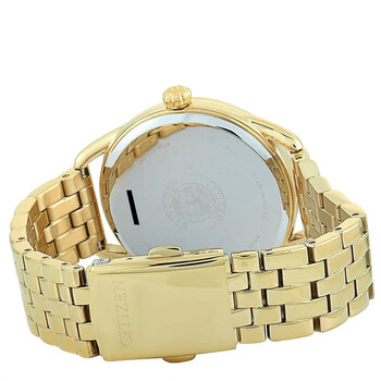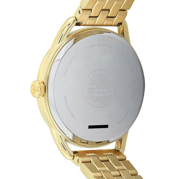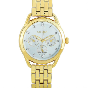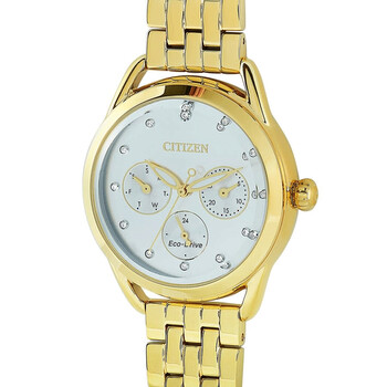 Yellow gold-tone stainless steel case and bracelet. Fixed yellow gold-tone bezel. Silver dial with luminous yellow gold-tone hands and Swarovski crystal hour markers. Dial Type: Analog. Luminescent hands. Three sub-dials displaying: date, day of the week, and 24 hour. Citizen caliber Eco-Drive 8729 quartz movement. Scratch resistant mineral crystal. Pull / push crown. Solid case back. Round case shape. Case size: 38 mm. Band width: 17 mm. Deployment clasp with a push button release. Water resistant at 30 meters / 100 feet. Functions: date, day, GMT, second time zone, hour, minute, second, solar-powered. Ltr Series. Luxury watch style. Watch label: Japan Movt. Citizen LTR Quartz Silver Dial Ladies Watch FD2052-58A.