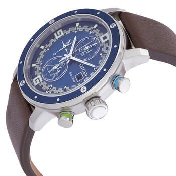 Silver-tone stainless steel case with a brown leather strap. Blue stainless steel bezel. Blue dial with silver-tone hands and index hour markers. Minute markers around the outer rim. Dial Type: Analog. Date display at the 3 o'clock position. Chronograph - three sub-dials displaying: 60 second, 60 minute and 24 hour. Citizen Caliber Eco-Drive B612 eco-drive movement. Scratch resistant mineral crystal. Solid case back. Round case shape, case size: 44 mm. Band width: 22 mm. Buckle clasp. Water resistant at 100 meters / 330 feet. Functions: chronograph, date, hour, minute, second, solar-powered. Luke Skywalker Series. Sport watch style. Watch label: Japan Movt. Citizen Luke Skywalker Chronograph Blue Dial Men's Watch CA0768-07W.