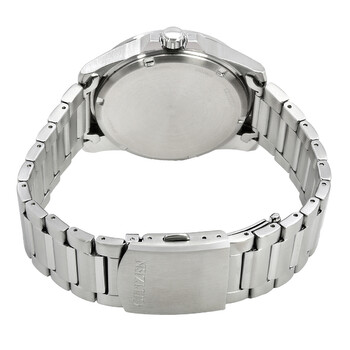 Silver-tone stainless steel case and bracelet. Fixed silver-tone stainless steel bezel with a black aluminum ring. Black dial with black hands and index hour markers. Minute markers around the outer rim. Dial Type: Analog. Luminescent hands and markers. Date display at the 3 o'clock position. Citizen Caliber Eco-Drive J810 eco-drive movement. Scratch resistant mineral crystal. Solid case back. Round case shape, case size: 41.5 mm, case thickness: 11.1 mm. Fold over clasp with a safety release. Water resistant at 100 meters / 330 feet. Functions: date, hour, minute, second, solar-powered. Marine 1810 Series. Sport watch style. Watch label: Japan Movt. Citizen Marine 1810 Eco-Drive Black Dial Men's Watch AW1816-89E.
