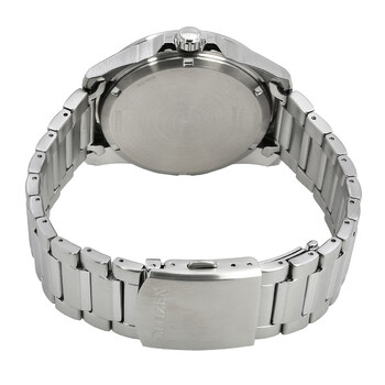 Silver-tone stainless steel case and bracelet. Fixed silver-tone stainless steel bezel with a black aluminum ring. Turquoise dial with black hands and index hour markers. Minute markers around the outer rim. Dial Type: Analog. Luminescent hands and markers. Date display at the 3 o'clock position. Citizen Caliber Eco-Drive J810 eco-drive movement. Scratch resistant mineral crystal. Solid case back. Round case shape, case size: 41.5 mm, case thickness: 11.1 mm. Fold over clasp with a safety release. Water resistant at 100 meters / 330 feet. Functions: date, hour, minute, second, solar-powered. Marine 1810 Series. Sport watch style. Watch label: Japan Movt. Citizen Marine 1810 Eco-Drive Turquoise Dial Men's Watch AW1816-89L.