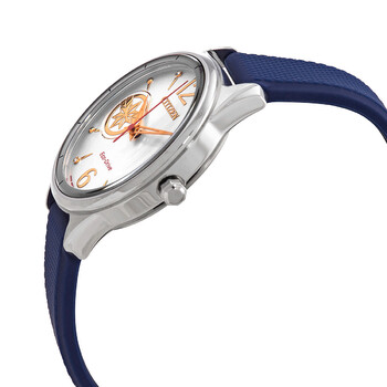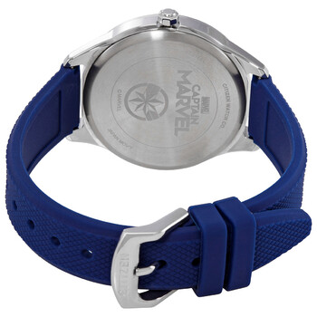 Stainless steel case with a blue silicone strap. Fixed stainless steel bezel. Silver dial with gold-tone skeleton hands and crystal-tipped index hour markers. Arabic numerals appear at the 6 and 12 o'clock positions. Dial Type: Analog. Date display at the 3 o'clock position. Citizen caliber J810 eco-drive movement. Scratch resistant mineral crystal. Pull / push crown. Solid case back. Round case shape. Case size: 37 mm. Case thickness: 9.4 mm. Band width: 14 mm. Tang clasp. Water resistant at 50 meters / 165 feet. Functions: date, hour, minute, second. Marvel Series. Casual watch style. Citizen Marvel Eco-Drive Silver Dial Ladies Watch FE6101-05W.