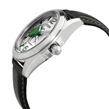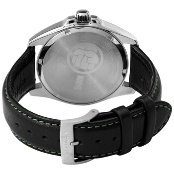 Stainless steel case with a black leather strap. Fixed stainless steel bezel. Silver (Hulk) dial with luminous green hands and index hour markers. Arabic numerals appear atthe 3, 6 and 12 o'clock positions. Minute markers around the outer rim. Dial Type: Analog. Luminescent hands. Date display at the 3 o'clock position. Citizen caliber Eco-Drive J810 eco-drive movement. Scratch resistant mineral crystal. Solid case back. Round case shape. Case size: 45 mm. Case thickness: 11 mm. Band width: 22 mm. Tang clasp. Water resistant at 100 meters / 330 feet. Functions: date, hour, minute, second, solar-powered. Marvel Hulk Series. Dress watch style. Watch label: Japan Movt. Citizen Marvel Hulk Eco-Drive Silver Dial Men's Watch AW1431-24W.
