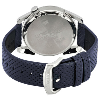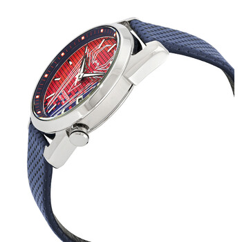 Silver-tone stainless steel case with a blue leather strap. Fixed silver-tone stainless steel bezel. Red dial with blue accents in a pixilated style with black hands and index hour markers. Minute markers around the outer rim. Dial Type: Analog. Luminescent hands and markers. Date display at the 4 o'clock position. Eco-drive movement. Scratch resistant mineral crystal. Solid case back. Round case shape, case size: 42 mm. Buckle clasp. Water resistant at 100 meters / 330 feet. Functions: date, hour, minute, second. Marvel Series. Casual watch style. Citizen Marvel Red Dial Spider-man Men's Watch AW1680-03W.