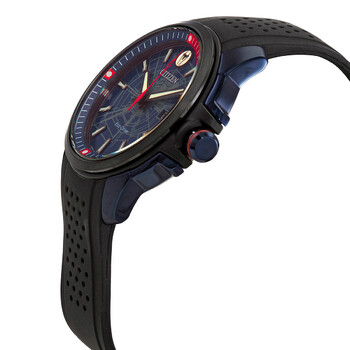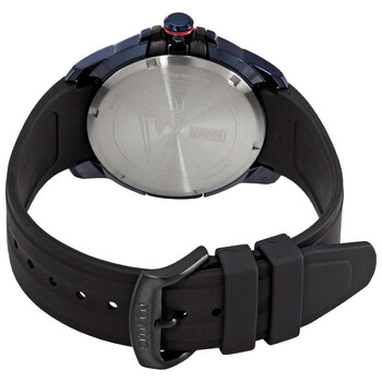 Blue ion-plated stainless steel case with a black (polycarbonate) silicone strap. Fixed black ion-plated bezel. Blue ( spider-man ) dial with luminous black hands and index hour markers. Minute markers around the outer rim. Dial Type: Analog. Luminescent hands and markers. Date display at the 3 o'clock position. Citizen caliber Eco-Drive J810 eco-drive movement. Scratch resistant mineral crystal. Solid case back. Round case shape. Case size: 44 mm. Case thickness: 11 mm. Band width: 21 mm. Tang clasp. Water resistant at 100 meters / 330 feet. Functions: date, hour, minute, second, solar-powered. Marvel Spider-man Series. Dress watch style. Watch label: Japan Movt. Citizen Marvel Spider-Man Blue Dial Men's Watch AW1156-01W.
