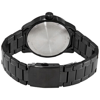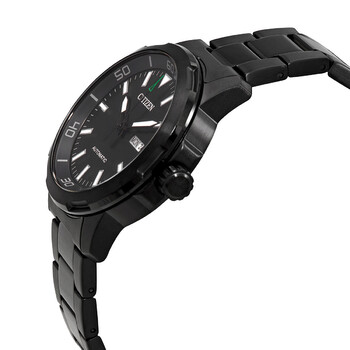Black-plated stainless steel case and bracelet. Fixed black-plated bezel. Balck dial with luminous black hands and index hour markers. Minute markers. Arabic numeral minute markers (at 10 minute intervals) around the outer rim. Dial Type: Analog. Luminescent hands and markers. Day of the week and date display at the 3 o'clock position. Citizen caliber 8200 automatic movement. Scratch resistant mineral crystal. Pull / push crown. Solid case back. Round case shape. Case size: 44 mm. Case thickness: 11.5 mm. Band width: 20 mm. Fold over clasp with a push button release. Water resistant at 50 meters / 165 feet. Functions: date, day, hour, minute, second. Dress watch style. Watch label: Japan Movt. Citizen Mechanical Automatic Black Dial Men's Watch NH8375-82E.