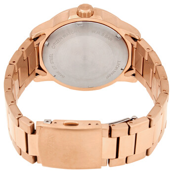 Rose gold-tone stainless steel case and bracelet. Fixed rose gold-tone bezel. White dial with luminous gold-tone hands and index hour markers. Minute markers. Arabic numeral minute markers (at 10 minute intervals) around the outer rim. Dial Type: Analog. Luminescent hands and markers. Day of the week and date display at the 3 o'clock position. Citizen caliber 8200 automatic movement. Scratch resistant mineral crystal. Pull / push crown. Solid case back. Round case shape. Case size: 44 mm. Case thickness: 11.5 mm. Band width: 20 mm. Fold over clasp with a push button release. Water resistant at 50 meters / 165 feet. Functions: date, day, hour, minute, second. Dress watch style. Watch label: Japan Movt. Citizen Mechanical Automatic White Dial Rose Gold-tone Men's Watch NH8373-88A.