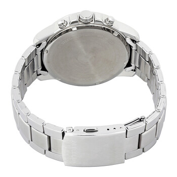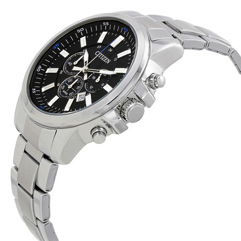 Stainless steel case with a stainless steel bracelet. Fixed bezel. Black dial with silver-tone, blue second hand hands and index hour markers. Minute markers around the outer rim. Dial Type: Analog. Luminescent hands and markers. Date display between 4 and 5 o'clock position. Chronograph - three sub-dials displaying: 60 second, 60 minute and 24 hours. Quartz movement. Scratch resistant mineral crystal. Pull / push crown. Solid case back. Case size: 45 mm. Round case shape. Deployment with push button release clasp. Water resistant at 50 meters / 165 feet. Functions: chronograph, date, hour, minute, second. Casual watch style. Citizen Men's Chronograph Stainless Steel Watch AN8085-56E.