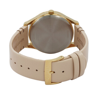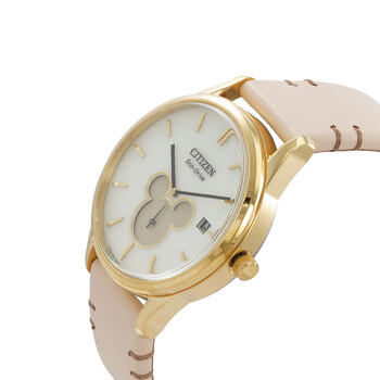 Gold-tone stainless steel case with a pink leather strap. Fixed gold-tone stainless steel bezel. White dial with black hands and index hour markers. Dial Type: Analog. Date display at the 3 o'clock position. Sub second hand subdials. Eco-drive movement. Scratch resistant mineral crystal. Pull / push crown. Solid case back. Round case shape, case size: 40 mm. Band width: 20 mm. Buckle clasp. Water resistant at 50 meters / 165 feet. Functions: date, hour, minute, sub second hand. Mickey Shadow Series. Casual watch style. Watch label: Japan Movt. Citizen Mickey Shadow Eco-Drive White Dial Unisex Watch BV1132-08W.