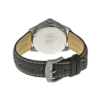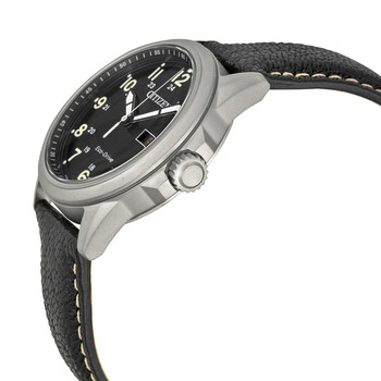 Stainless steel case with a black leather strap. Fixed stainless steel bezel. Black dial with luminous hands and Arabic numeral hour markers. 24 hour markers. Minute markers around the outer rim. Dial Type: Analog. Luminescent hands and markers. Day of the week and date display at the 3 o'clock position. Quartz movement. Scratch resistant mineral crystal. Solid case back. Case diameter: 37 mm. Case thickness: 10 mm. Round case shape. Band width: 18 mm. Band length: 9.5 inches. Tang clasp. Water resistant at 100 meters / 330 feet. Functions: date, day, hour, minute, second. Casual watch style. Citizen Military Eco-Drive Black Dial Black Leather Quartz Men's Watch AW0040-01E.
