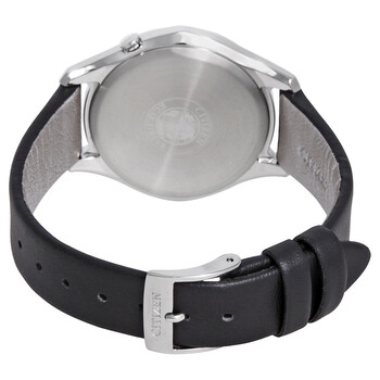 Stainless steel case with a black leather strap. Fixed black ion-plated bezel. Black dial with rose gold-tone skeleton hands and index hour markers. Dial Type: Analog. Citizen caliber Eco-Drive E031 quartz movement. Scratch resistant mineral crystal. Pull / push crown. Solid case back. Round case shape. Case size: 36 mm. Case thickness: 8 mm. Band width: 16 mm. Band length: 7 inches. Tang clasp. Water resistant at 50 meters / 165 feet. Functions: hour, minute, second. Casual watch style. Watch label: Japan Movt. Citizen Modena Black Dial Black Leather Ladies Watch EM0591-01E.