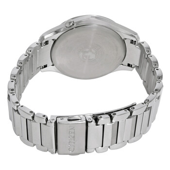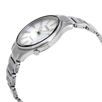 Silver-tone stainless steel case with a silver-tone stainless steel bracelet. Fixed silver-tone stainless steel bezel. Silver dial with silver-tone hands and index hour markers. Dial Type: Analog. Eco-Drive movement. Scratch resistant mineral crystal. Solid case back. Case size: 36 mm. Round case shape. Water resistant at 50 meters / 165 feet. Functions: hour, minute, second. Casual watch style. Citizen Modena Eco-Drive Silver Dial Ladies Stainless Steel Watch EM0590-54A.