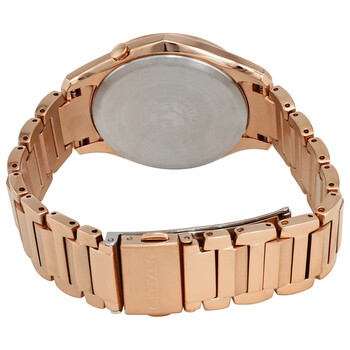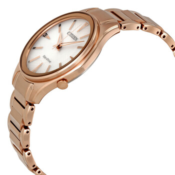 Rose gold-tone stainless steel case and bracelet. Fixed rose gold-tone bezel. White dial with rose gold-tone skeleton hands and index hour markers. Dial Type: Analog. Citizen caliber Eco-Drive E031 eco-drive movement. Scratch resistant mineral crystal. Pull / push crown. Solid case back. Round case shape. Case size: 36 mm. Case thickness: 8.4 mm. Band width: 17 mm. Fold over clasp with a push button release. Water resistant at 50 meters / 165 feet. Functions: hour, minute, second. Casual watch style. Watch label: Japan Movt. Citizen Modena White Dial Rose Gold-tone Ladies Watch EM0593-56A.