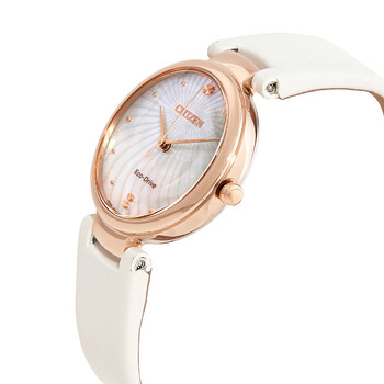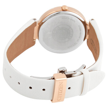 Rose gold-tone stainless steel case with a white satin strap. Fixed rose gold-tone bezel. Mother of pearl dial with rose gold-tone hands and dot hour markers. Dial Type: Analog. Citizen caliber E031 eco-drive movement. Scratch resistant sapphire crystal. Pull / push crown. Solid case back. Round case shape. Case size: 31 mm. Case thickness: 8 mm. Band width: 17 mm. Fold over clasp with a push button release. Water resistant at 50 meters / 165 feet. Functions: hour, minute, second. Casual watch style. Watch label: Japan Movt. Citizen Mother of Pearl Dial White Satin Ladies Watch EM0853-22D.