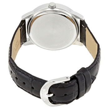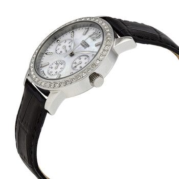 Stainless steel case with a black leather strap. Fixed stainless steel bezel set with crystals. Mother of pearl dial with luminous silver-tone hands and index hour markers. An Arabic numeral appears at then 12 o'clock position. Minute markers around the outer rim. Dial Type: Analog. Luminescent hands and markers. Date display at the 3 o'clock position. Three multi-function sub-dials displaying: date, day of the week and 24 hours. Citizen caliber 6329 quartz movement. Scratch resistant mineral crystal. Pull / push crown. Solid case back. Round case shape. Case size: 35 mm. Case thickness: 9 mm. Band width: 16 mm. Tang clasp. Water resistant at 30 meters / 100 feet. Functions: date, day, hour, minute, second. Dress watch style. Watch label: Japan Movt. Citizen Multifunction Mother of Pearl Dial Ladies Watch ED8090-11D.