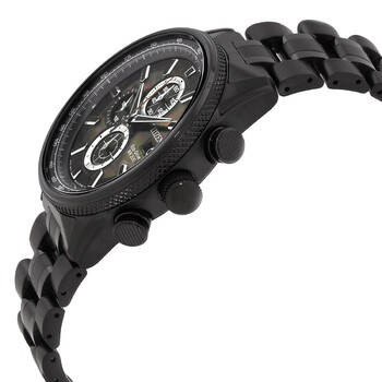 Black stainless steel case and bracelet. Fixed black stainless steel bezel. Green camo dial with silver-tone hands and index hour markers. Minute markers around the outer rim. Dial Type: Analog. Luminescent hands and markers. Date display at the 3 o'clock position. Chronograph - three sub-dials displaying: 60 second, 60 minute and 24 hour. Citizen Caliber Eco-Drive B612 eco-drive movement. Scratch resistant mineral crystal. Screw down crown. Solid case back. Round case shape, case size: 43 mm. Band width: 22 mm. Fold over clasp with a safety release. Water resistant at 200 meters / 660 feet. Functions: chronograph, date, hour, minute, second, solar-powered. Nighthawk Series. Sport watch style. Watch label: Japan Movt. Citizen Nighthawk Chronograph Green Camo Dial Men's Watch CA0805-53X.