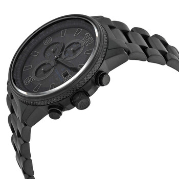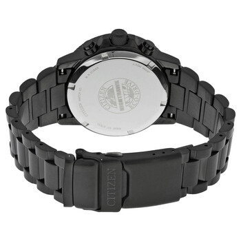 Black ion-plated stainless steel case and bracelet. Fixed black ion-plated bezel. Black dial with black hands and index hour markers. Arabic numerals mark the 3, 6, 9 and 12 o'clock positions. Minute markers. Tachymeter around the outer rim. Dial Type: Analog. Luminescent hands and markers. Date display at the 3 o'clock position. Chronograph - three sub-dials displaying: 60 second, 60 minute and 24 hour. Eco-Drive B612 eco-drive movement. Scratch resistant mineral crystal. Screw down crown. Solid case back. Case size: 42 mm. Case thickness: 13 mm. Round case shape. Band width: 22 mm. Band length: 7.5 inches. Fold over clasp with a push button release. Water resistant at 200 meters / 660 feet. Functions: chronograph, GMT, date, hour, minute, second. Additional Info: light - powered environmentally clean energy source. Casual watch style. Watch label: Japan Movt. Item Variations: CA0295 58E, CA0295.58E, CA029558E. Citizen NightHawk EcoDrive Chronograph Black Dial Men's Watch CA0295-58E.