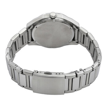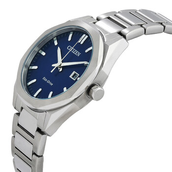 Silver-tone stainless steel case and bracelet. Fixed silver-tone stainless steel bezel. Blue dial with silver-tone hands and index hour markers. Minute markers around the outer rim. Dial Type: Analog. Date display at the 3 o'clock position. Citizen Caliber Eco-Drive E111 eco-drive movement. Scratch resistant mineral crystal. Solid case back. Octagon case shape, case size: 38 mm, case thickness: 9.7 mm. Fold over clasp with a safety release. Water resistant at 100 meters / 330 feet. Functions: date, hour, minute, second, solar-powered. Octangle Series. Casual watch style. Watch label: Japan Movt. Citizen Octangle Eco-Drive Blue Dial Unisex Watch BM7620-83L.