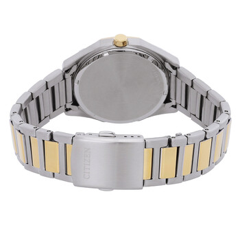 Silver-tone stainless steel case with a two-tone (silver-tone and gold-tone) stainless steel bracelet. Fixed gold-tone stainless steel bezel. White dial with gold-tone hands and index hour markers. Minute markers around the outer rim. Dial Type: Analog. Date display at the 3 o'clock position. Citizen Caliber Eco-Drive E111 eco-drive movement. Scratch resistant mineral crystal. Solid case back. Octagon case shape, case size: 38 mm, case thickness: 9.7 mm. Band width: 20 mm. Fold over clasp with a safety release. Water resistant at 100 meters / 330 feet. Functions: date, hour, minute, second, solar-powered. Octangle Series. Casual watch style. Watch label: Japan Movt. Citizen Octangle Eco-Drive White Dial Two-Tone Men's Watch BM7624-82A.