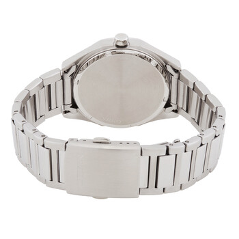 Silver-tone stainless steel case and bracelet. Fixed silver-tone stainless steel bezel. White dial with black hands and index hour markers. Minute markers around the outer rim. Dial Type: Analog. Date display at the 3 o'clock position. Citizen Caliber Eco-Drive E111 eco-drive movement. Scratch resistant mineral crystal. Solid case back. Octagon case shape, case size: 38 mm, case thickness: 9.7 mm. Fold over clasp with a safety release. Water resistant at 100 meters / 330 feet. Functions: date, hour, minute, second, solar-powered. Octangle Series. Casual watch style. Watch label: Japan Movt. Citizen Octangle Eco-Drive White Dial Unisex Watch BM7620-83A.
