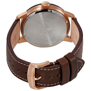 Rose gold-tone stainless steel case with a brown leather strap. Fixed rose gold-tone stainless steel bezel with an inlaid black ring. Orange dial with luminous rose gold-tone hands and index hour markers. Arabic numeral appears at the 12 o'clock position. Minute markers around the outer rim. Dial Type: Analog. Luminescent hands and markers. Day of the week and date display at the 3 o'clock position. J800 eco-drive movement. Scratch resistant mineral crystal. Pull / push crown. Solid case back. Round case shape, case size: 43.5 mm, case thickness: 12 mm. Band width: 20 mm. Tang clasp. Water resistant at 100 meters / 330 feet. Functions: date, day, hour, minute, second. Casual watch style. Citizen Orange Dial Brown Leather Men's Watch AW0079-13X.