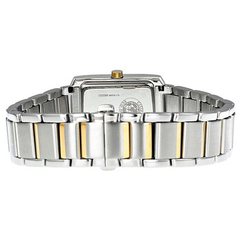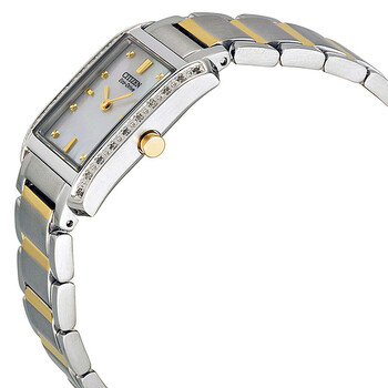 Stainless steel case with a two-tone (silver and gold-tone) stainless steel bracelet. Fixed silver-tone bezel set with 20 diamonds. Mother of pearl dial with gold-tone hands and stick hour markers. Dial Type: Analog. Eco-drive movement. Scratch resistant mineral crystal. Pull / push crown. Solid case back. Case dimensions: 25 mm x 21 mm. Case thickness: 7 mm. Rectangle case shape. Band width: 15 mm. Deployment clasp with push button. Water resistant at 30 meters / 100 feet. Functions: hour, minute. Dress watch style. Citizen Palidoro Eco-Drive Diamond Mother of Pearl Dial Two-Tone Stainless Steel Ladies Watch EX1134-59D.