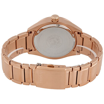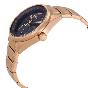 Rose gold-tone stainless steel case and bracelet. Fixed rose gold-tone bezel. Blue dial with luminous rose gold-tone hands and index hour markers. Arabic numeral minute markers (at 5 minute intervals). Minute markers around the outer rim. Dial Type: Analog. Luminescent hands and markers. Date display at the 12 o'clock position. Two sub-dials displaying: date and 24 hours. Citizen caliber Eco-Drive 8723 eco-drive movement. Scratch resistant mineral crystal. Pull / push crown. Solid case back. Round case shape. Case size: 43 mm. Case thickness: 12 mm. Band width: 22 mm. Fold over clasp with a push button release. Water resistant at 100 meters / 330 feet. Functions: date, hour, minute, second. Military watch style. Watch label: Japan Movt. Citizen Paradex Blue Dial Rose Gold-tone Men's Watch BU3013-53L.