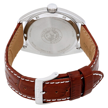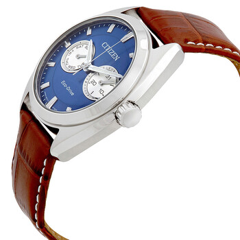Stainless steel case with a brown leather strap. Fixed stainless steel bezel. Blue dial with luminous silver-tone hands and index hour markers. Minute markers around the outer rim. Dial Type: Analog. Luminescent hands and markers. Date display at the 3 o'clock position. Two sub-dials displaying: date, day of the week. Citizen caliber Eco-Drive 8725 eco-drive movement. Scratch resistant mineral crystal. Pull / push crown. Solid case back. Case size: 44 mm. Round case shape. Tang clasp. Water resistant at 100 meters / 330 feet. Functions: date, day, hour, minute, second. Casual watch style. Watch label: Japan Movt. Citizen Paradex Eco-Drive Blue Dial Brown Leather Men's Watch BU4010-05L.