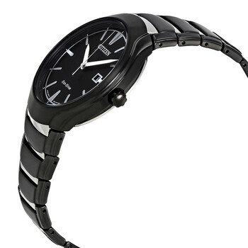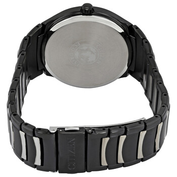 Black-tone stainless steel case with a two-tone (black and silver-tone) stainless steel bracelet. Fixed black-tone bezel. Black dial with luminous silver-tone hands and index hour markers. Dial Type: Analog. Luminescent hands and markers. Date display at the 3 o'clock position. Citizen Caliber Eco-Drive J810 eco-drive movement. Scratch resistant mineral crystal. Pull / push crown. Solid case back. Round case shape. Case size: 40 mm. Case thickness: 9 mm. Band width: 26 mm. Fold over clasp with a push button release. Water resistant at 50 meters / 165 feet. Functions: date, hour, minute, second. Casual watch style. Watch label: Japan Movt. Citizen Paradigm Black Dial Men's Watch AW1558-58E.