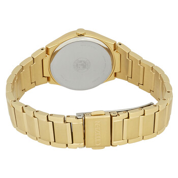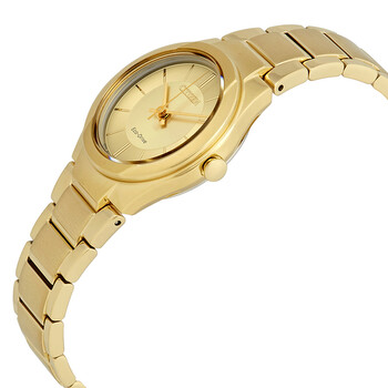 Yellow gold-tone stainless steel case and bracelet. Fixed yellow gold-tone bezel. Champagne dial with yellow gold-tone hands and index hour markers. Dial Type: Analog. Citizen Caliber Eco-Drive J730 quartz movement. Scratch resistant mineral crystal. Pull / push crown. Solid case back. Round case shape. Case size: 29 mm. Case thickness: 8 mm. Band width: 14 mm. Fold over clasp with a push button release. Water resistant at 50 meters / 165 feet. Functions: hour, minute, second. Casual watch style. Citizen Paradigm Champagne Dial Yellow Gold-tone Ladies Watch FE2092-57P.