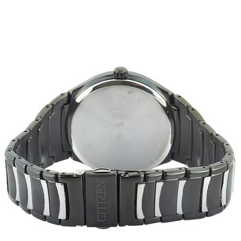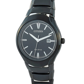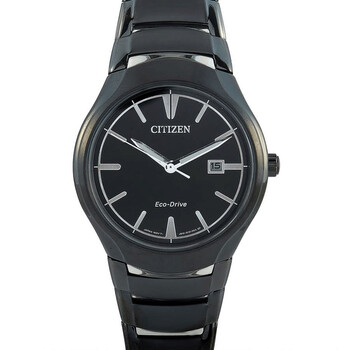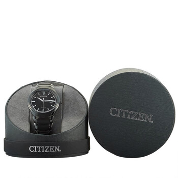 Black stainless steel case and bracelet. Fixed black stainless steel bezel. Black dial with silver-tone hands and index hour markers. Dial Type: Analog. Date display at the 3 o'clock position. Citizen Caliber Eco-Drive J810 quartz movement. Solid case back. Round case shape, case size: 40 mm. Deployment with push button release clasp. Water resistant at 50 meters / 165 feet. Functions: date, hour, minute, second, solar-powered. Paradigm Series. Luxury watch style. Watch label: Japan Movt. Citizen Paradigm Quartz Black Dial Men's Watch AW1558-58E.