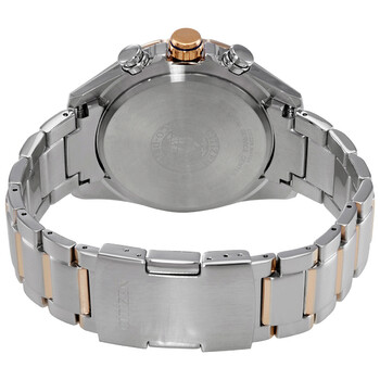 Stainless steel case with a two-tone (silver-tone and rose gold-tone) stainless steel bracelet. Fixed rose gold-tone bezel showing tachymeter markings. Blue dial with luminous rose gold-tone hands and index hour markers. Minute markers around the outer rim. Dial Type: Analog. Luminescent hands and markers. Date display at the 4 o'clock position. Three sub-dials displaying: 24 hours, alarm/chronograph and day of the week. Citizen caliber E660 eco-drive movement. Scratch resistant sapphire crystal. Solid case back. Round case shape. Case size: 43 mm. Case thickness: 13.1 mm. Band width: 22 mm. Fold over clasp with a safety release. Water resistant at 200 meters / 660 feet. Functions: chronograph, hour, minute, second, perpetual calendar, alarm, radio controlled, world time. Pcat Series. Casual watch style. Citizen PCAT Chronograph Eco-Drive Blue Dial Men's Watch CB5916-59L.