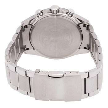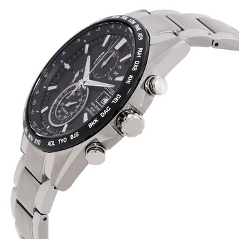 Silver-tone super titanium, duratect tic case and bracelet. Black dial with luminous silver-tone hands and index hour markers. Minute markers. World time cities around the outer rim. Dial Type: Analog. Luminescent hands. Date display at the 3 o'clock position. perpetual calendar. Three sub-dials displaying: 60 second, 24 hour and dual 1/100th of a second/day of the week. Eco-Drive H800 Atomic Timekeeping Radio Controlled eco-drive movement. Scratch resistant sapphire crystal. Solid case back. Round case shape, case size: 42.2 mm, case thickness: 10.2 mm. Deployment with push button release clasp. Water resistant at 100 meters / 330 feet. Functions: perpetual calendar, chronograph, world time, alarm, date, day, GMT, second time zone, hour, minute, second, solar-powered. Sport watch style. Watch label: Japan Movt. Citizen Perpetual Alarm World Time Chronograph Black Dial Men's Watch AT8154-82E.