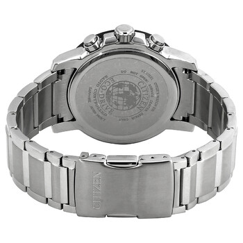 Silver-tone stainless steel case and bracelet. Black stainless steel bezel. Black dial with silver-tone hands and Arabic numeral hour markers. Dial Type: Analog. Date display at the 3 o'clock position. Three sub-dials displaying: 60 second, 24 hour and dual 1/100th of a second/day of the week. Eco-Drive H800 Atomic Timekeeping Radio Controlled eco-drive movement. Scratch resistant sapphire crystal. Round case shape, case size: 43.1mm, case thickness: 11.6 mm. Water resistant at 200 meters / 660 feet. Functions: perpetual calendar, chronograph, world time, alarm, date, day, GMT, second time zone, hour, minute, second, solar-powered. Sport watch style. Watch label: Japan Movt. Citizen Perpetual Alarm World Time Chronograph GMT Black Dial Watch AT8124-83E.