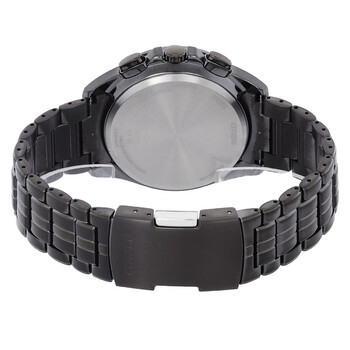 Black stainless steel case and bracelet. Black bezel. Black/blue dial with silver-tone hands and index hour markers. Minute markers around the outer rim. Dial Type: Analog. Luminescent hands and markers. Date display at the 4 o'clock position. Three-24 hour,60 second/day and function subdials. Citizen Caliber E660 quartz movement. Scratch resistant sapphire crystal. Solid case back. Round case shape, case size: 43 mm, case thickness: 23 mm. Fold over clasp with a safety release. Water resistant at 100 meters / 330 feet. Functions: date, day, hour, minute, second,perpetual calendar,12/24 hour time,alarm,power reserve indicator. Perpetual Chrono A-t Series. Sport watch style. Watch label: Japan Movt. Citizen Perpetual Chrono A-T Alarm Quartz Men's Watch CB5878-56E.