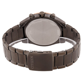Grey stainless steel case and bracelet. Fixed rose gold-tone stainless steel bezel. Red dial with rose gold-tone hands and index hour markers. Minute markers around the outer rim. Dial Type: Analog. Date display at the 3 o'clock position. Chronograph - sub-dials displaying: stopwatch and 24 hour. Citizen Caliber H800 eco-drive movement. Scratch resistant sapphire crystal. Solid case back. Round case shape, case size: 43 mm. Band width: 22 mm. Fold over clasp with a safety release. Water resistant at 100 meters / 330 feet. Functions: chronograph, date, hour, minute, second, 26 time zones, a perpetual calendar, 12 / 24-hour timekeeping, a power reserve display. Dress watch style. Citizen Perpetual Chronograph Red Dial Men's Watch AT8267-86X.