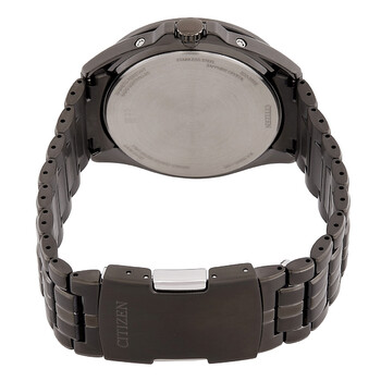 Black stainless steel case and bracelet. Fixed black stainless steel bezel. Black dial with black hands and index hour markers. Minute markers around the outer rim. Dial Type: Analog. Luminescent hands and markers. Date display at the 3 o'clock position. Date, signal reception indicator, summer time indicator subdials. Citizen Caliber Eco-Drive H145 eco-drive movement. Scratch resistant sapphire crystal. Round case shape, case size: 43 mm, case thickness: 9.8 mm. Fold over clasp with a safety release. Water resistant at 100 meters / 330 feet. Functions: perpetual calendar, atomic timekeeping, radio controlled, world time, date, hour, minute, second, solar-powered. Sport watch style. Watch label: Japan Movt. Citizen Perpetual World Time Black Dial Men's Watch CB0294-54E.