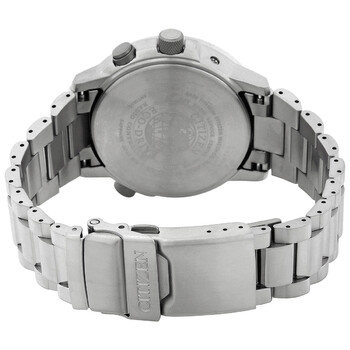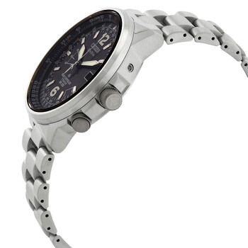 Silver-tone super titanium case and bracelet. Fixed silver-tone super titanium bezel. Black dial with silver-tone hands and index-Arabic numeral hour markers. Arabic numeral marker appears at the 6 and 12 o'clock positions. Minute markers around the outer rim. Dial Type: Analog. Date display at the 3 o'clock position. Date, signal reception indicator, summer time indicator subdials. Citizen Caliber Eco-Drive H145 eco-drive movement. Scratch resistant sapphire crystal. Screw down crown. Solid case back. Round case shape, case size: 43 mm, case thickness: 12 mm. Band width: 22 mm. Fold over clasp with a safety release. Water resistant at 200 meters / 660 feet. Functions: perpetual calendar, atomic timekeeping, radio controlled, world time, date, GMT, second time zone, hour, minute, second, solar-powered. Sport watch style. Watch label: Japan Movt. Citizen Perpetual World Time GMT Eco-Drive Black Dial Men's Watch CB0230-81E.
