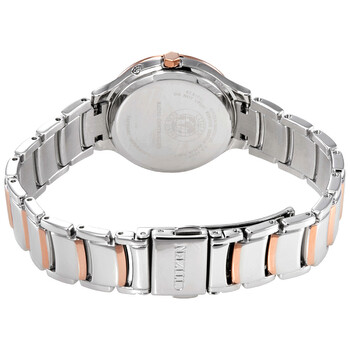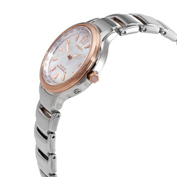 Two-toned (silver-tone, gold-tone) stainless steel case and bracelet. Fixed stainless steel bezel. Mother of pearl dial with rose gold-tone hands and index-Roman numeral hour markers. Roman numeral at the 12 0' clock position. Dial Type: Analog. Date display at the 3 o'clock position. Eco-drive movement. Scratch resistant sapphire crystal. Pull / push crown. Solid case back. Round case shape, case size: 30 mm, case thickness: 8.5 mm. Band width: 10 mm. Folding clasp. Water resistant at 50 meters / 165 feet. Functions: hour, minute, second, radio-controlled, world time,perpetual calendar, power saving mode, shock detection function. Dress watch style. Watch label: Japan Movt. Citizen Perpetual World Time Ladies Watch EC1174-84D.
