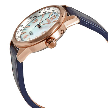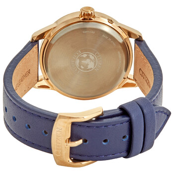 Rose gold-tone stainless steel case with a blue leather strap. Fixed rose gold-tone bezel. Mother of pearl dial with rose gold-tone hands and index hour markers. Arabic numerals mark the 6, 9 and 12 o'clock positions. Minute markers. World time cities around the outer rim. Dial Type: Analog. Luminescent hands. Date display at the 3 o'clock position. Citizen caliber E784 eco-drive movement. Scratch resistant sapphire crystal. Pull / push crown. Solid case back. Round case shape. Case size: 36 mm. Case thickness: 9.3 mm. Band width: 17 mm. Tang clasp. Water resistant at 50 meters / 165 feet. Functions: hour, minute, second, world time in 26 time zones, perpetual calendar. Casual watch style. Watch label: Japan Movt. Citizen Perpetual World Time Quartz Ladies Watch FC8003-06D.