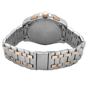 Silver-tone stainless steel case with a two-tone (silver-tone and rose gold-tone) stainless steel bracelet. Fixed rose gold-tone stainless steel bezel. Silver-tone dial with rose gold-tone hands and index hour markers. Minute markers around the outer rim. Dial Type: Analog. Luminescent hands and markers. Date display between 4 and 5 o'clock position. Chronograph - three sub-dials displaying: 60 second, 60 minute and 24 hour. Citizen Caliber Eco-Drive B620 eco-drive movement. Scratch resistant sapphire crystal. Solid case back. Round case shape, case size: 41 mm. Band width: 22 mm. Fold over clasp with a safety release. Water resistant at 100 meters / 330 feet. Functions: chronograph, date, hour, minute, second, solar-powered. Peyten Series. Dress watch style. Watch label: Japan Movt. Citizen Peyten Chronograph Eco-Drive Silver Dial Two-Tone Men's Watch CA4516-59A.