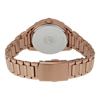 Pink gold-tone stainless steel case and bracelet. Fixed pink gold-tone bezel set with Swarovski crystals. Coral dial with luminous pink gold-tone hands and index hour markers. Minute markers around the outer rim. Dial Type: Analog. Luminescent hands and markers. Date display at the 12 o'clock position. Two sub-dials displaying: date and 24 hours. Citizen caliber Eco-Drive 8723 eco-drive movement. Scratch resistant mineral crystal. Pull / push crown. Solid case back. Round case shape. Case size: 33 mm. Case thickness: 10 mm. Band width: 17 mm. Band length: 7 inches. Fold over clasp with a push button release. Water resistant at 10 meters / 33 feet. Functions: date, hour, minute, second. Dress watch style. Watch label: Japan Movt. Item Variations: FD3003 58X, FD3003.58X, FD300358X. Citizen POV Eco-Drive Coral Dial Ladies Watch FD3003-58X.