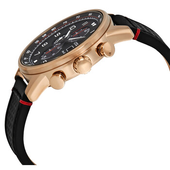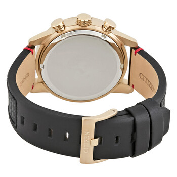 Rose gold-tone stainless steel case with a black leather strap. Fixed rose gold-tone bezel. Black dial with luminous black hands and Arabic numeral hour markers. Minute markers. Tachymeter markings around the outer rim. Dial Type: Analog. Luminescent hands. Date display at the 3 o'clock position. Chronograph - three sub-dials displaying: 60 second, 60 minute and 24 hour. Citizen caliber Eco-Drive B612 eco-drive movement. Scratch resistant mineral crystal. Solid case back. Round case shape. Case size: 45 mm. Case thickness: 12 mm. Band width: 21 mm. Tang clasp. Water resistant at 100 meters / 330 feet. Functions: chronograph, date, hour, minute, second, solar-powered. Additional Info: featuring eco-drive technology – powered by light, any light. never needs a battery. Sport watch style. Watch label: Japan Movt. Citizen Primo Chronograph Black Dial Men's Watch CA0683-08E.
