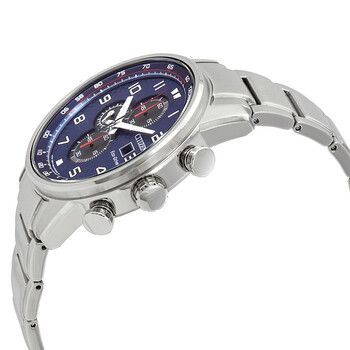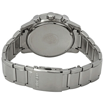 Stainless steel case with a stainless steel bracelet. Fixed stainless steel bezel. Blue carbon fiber dial with luminous silver-tone hands and Arabic numeral hour markers. Minute markers. Tachymeter markers around the outer rim. Dial Type: Analog. Luminescent hands. Date display at the 3 o'clock position. Chronograph - three black sub-dials displaying: 60 second, 60 minute and 24 hour. Citizen caliber Eco-Drive B612 eco-drive movement. Scratch resistant mineral crystal. Solid case back. Round case shape. Case size: 45 mm. Case thickness: 12 mm. Band width: 21 mm. Fold over clasp. Water resistant at 100 meters / 330 feet. Functions: chronograph, tachymeter, date, hour, minute, second, solar-powered. Additional Info: eco-drive technology uses natural and artificial light for power, so you never need to change or purchase batteries. Sport watch style. Watch label: Japan Movt. Citizen Primo Chronograph Eco-Drive Blue Dial Men's Watch CA0680-57L.
