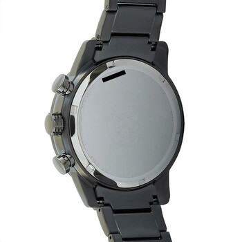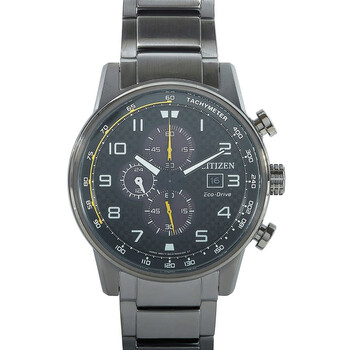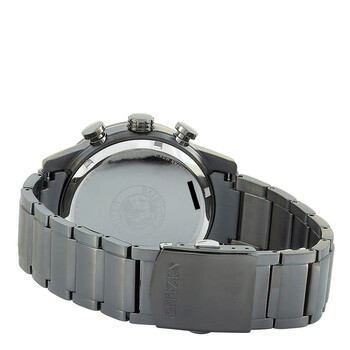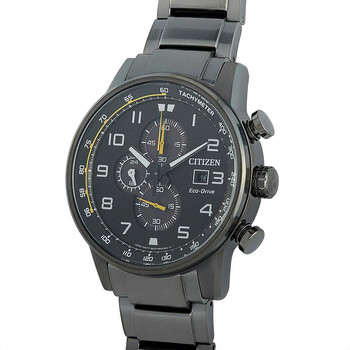 Grey ion-plated stainless steel case and bracelet. Fixed grey ion-plated bezel. Black dial with luminous black hands and Arabic numeral hour markers. Minute markers. Tachymeter markings around the outer rim. Dial Type: Analog. Luminescent hands and markers. Date display at the 3 o'clock position. Chronograph - three sub-dials displaying: 60 second, 60 minute and 24 hour. Citizen caliber Eco-Drive B612 quartz movement. Scratch resistant mineral crystal. Solid case back. Round case shape, Case size: 45 mm. Case thickness: 12 mm. Band width: 22 mm. Deployment clasp with a push button release. Water resistant at 100 meters / 330 feet. Functions: chronograph, tachymeter, date, hour, minute, second, solar-powered. Primo Series. Sport watch style. Watch label: Japan Movt. Citizen Primo Chronograph Quartz Black Dial Men's Watch CA0687-58E.