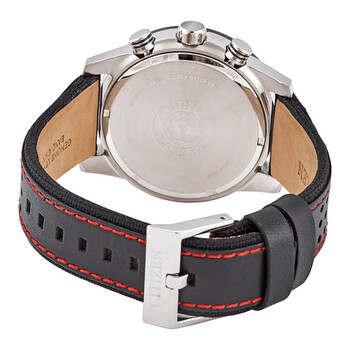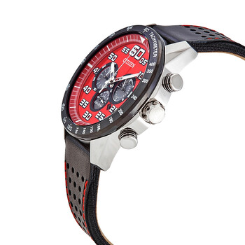 Stainless steel case with a black leather strap. Fixed black ion-plated bezel showing tachymeter markings. Red dial with luminous silver-tone hands and index hour markers. Arabic numeral minute markers (at 5 minute intervals). Minute markers around the outer rim. Dial Type: Analog. Luminescent hands. Date display between the 4 and 5 o'clock positions. Chronograph - three black sub-dials displaying: 60 second, 60 minute and 24 hours. Citizen caliber Eco-Drive B620 eco-drive movement. Scratch resistant sapphire crystal. Solid case back. Round case shape. Case size: 44 mm. Case thickness: 12.4 mm. Band width: 22 mm. Tang clasp. Water resistant at 100 meters / 330 feet. Functions: chronograph, tachymeter, date, hour, minute, second, solar-powered. Sport watch style. Watch label: Japan Movt. Citizen Primo Chronograph Quartz Red Dial Men's Watch CA4430-01X.